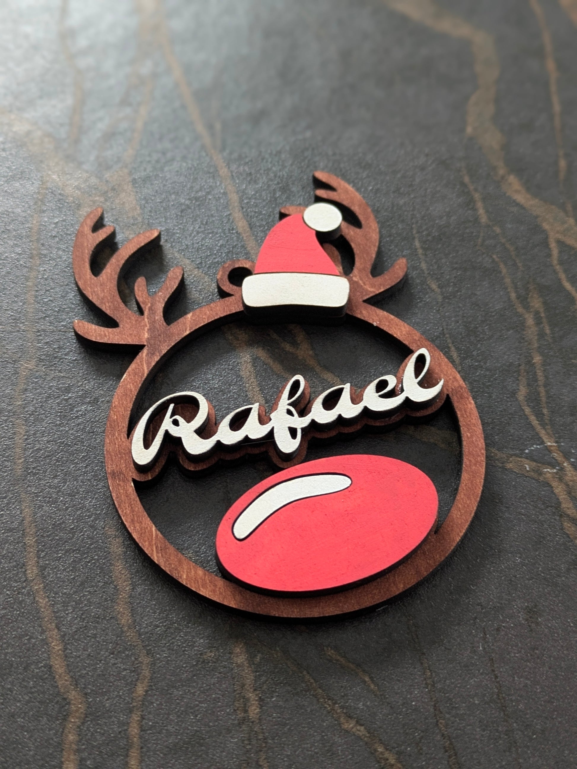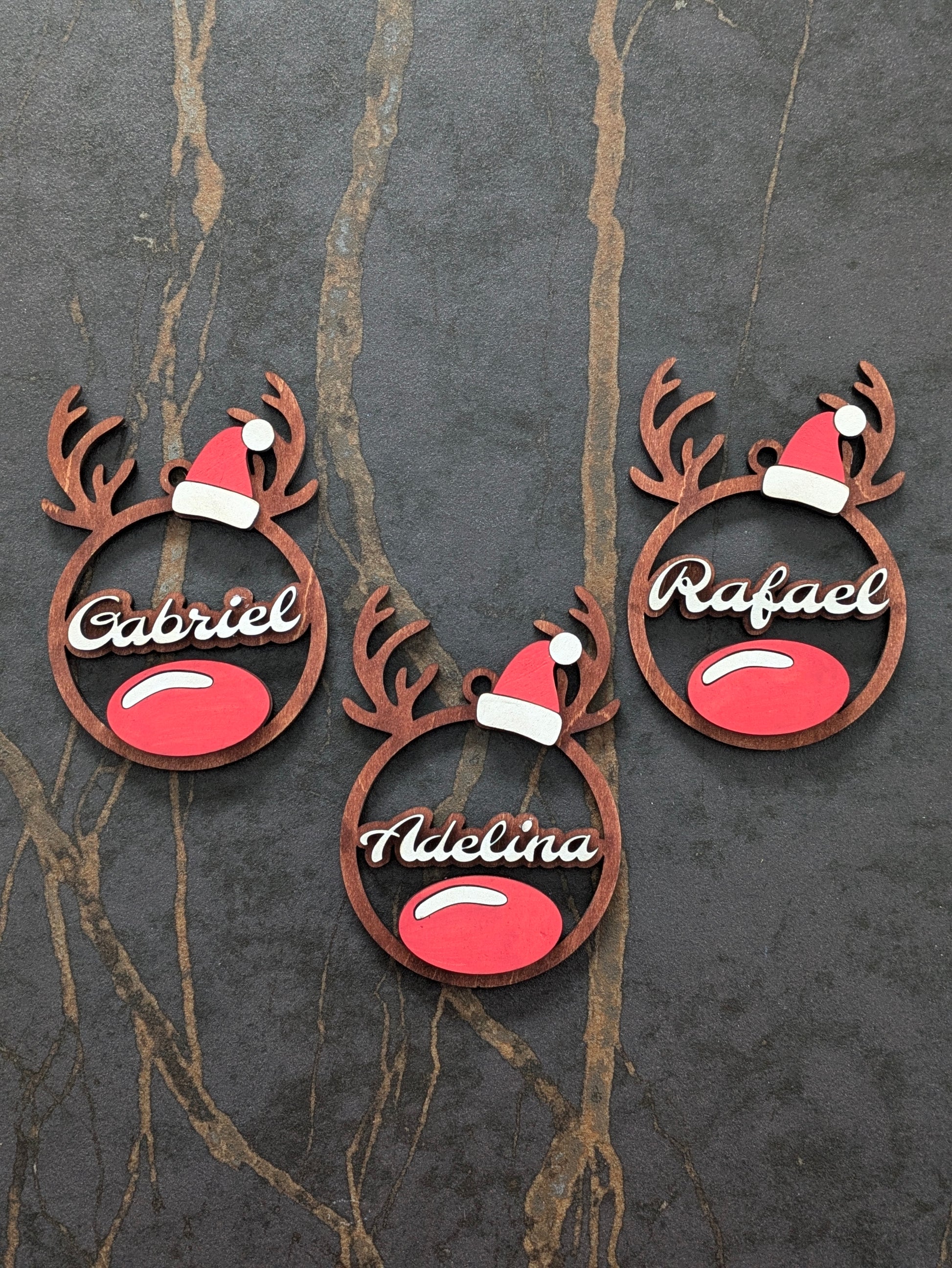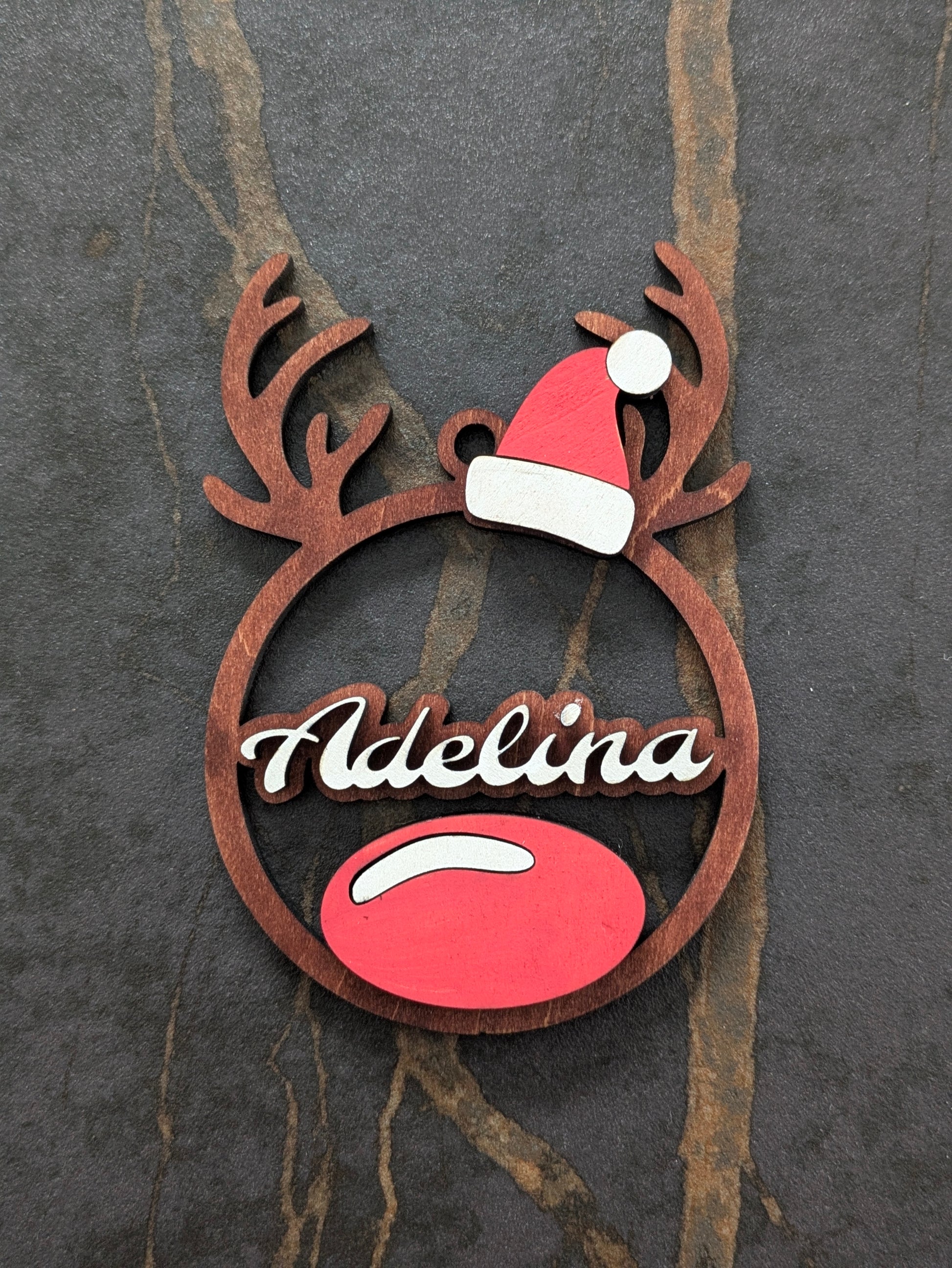 Add a festive touch to your holiday décor with this adorable custom reindeer ornament! Handcrafted from layered wood, this delightful design features a playful reindeer silhouette complete with antlers and a cheerful Santa hat.