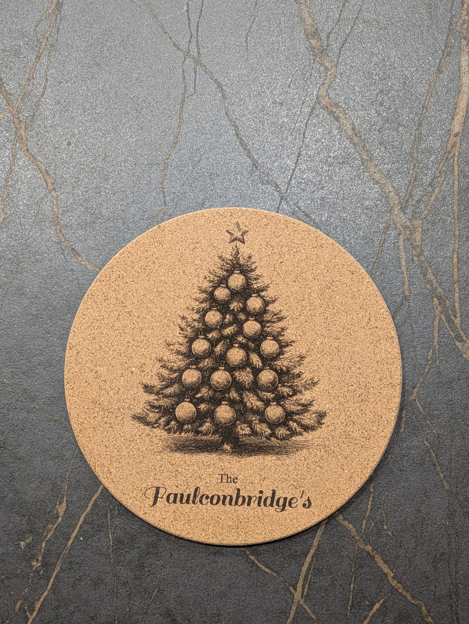 Personalized 8" Round Cork Trivet – Laser Engraved Christmas Tree Design